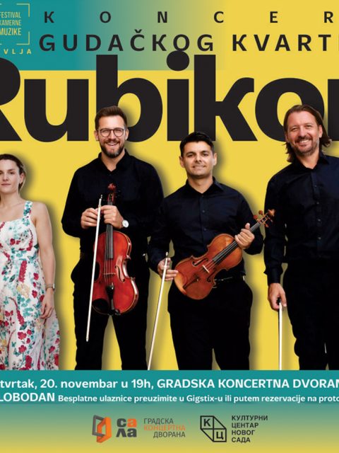 Gudački kvartet „Rubikon” održaće koncert u četvrtak, 20. novembra, u 19 časova, u Gradskoj koncertnoj dvorani. Ovaj ansambl predstavlja jedan od najistaknutijih kamernih sastava u Srbiji. Od svog prvog nastupa na festivalu „Grad teatar – Budva” 2003. godine, kvartet je dosledno gradio reputaciju izuzetnog umetničkog kolektiva, nastupajući u najprestižnijim koncertnim dvoranama u zemlji i inostranstvu. Njihov umetnički uspon obeležili su nastupi na festivalima BEMUS, NOMUS, kao i u sali Beogradske filharmonije, dok je posebno zapažen bio koncert u okviru ciklusa „Velikani muzičke scene”…
